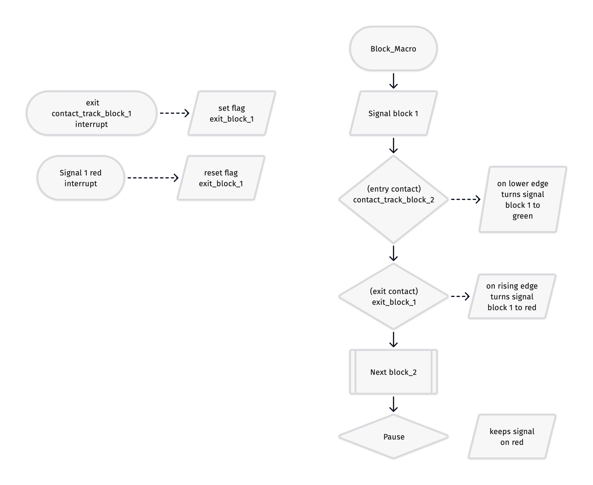 - The exit sensor of BLOCK 1 will close the signal 1 and open the signal 2