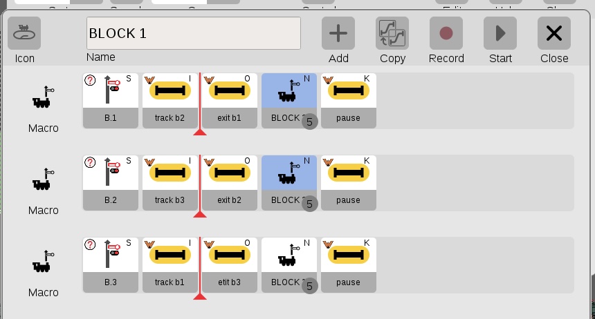 - the Block macro, seems not to be working properly as I cannot simulate a 2 loco operation because, in this case, 2n signals must be red and only one green