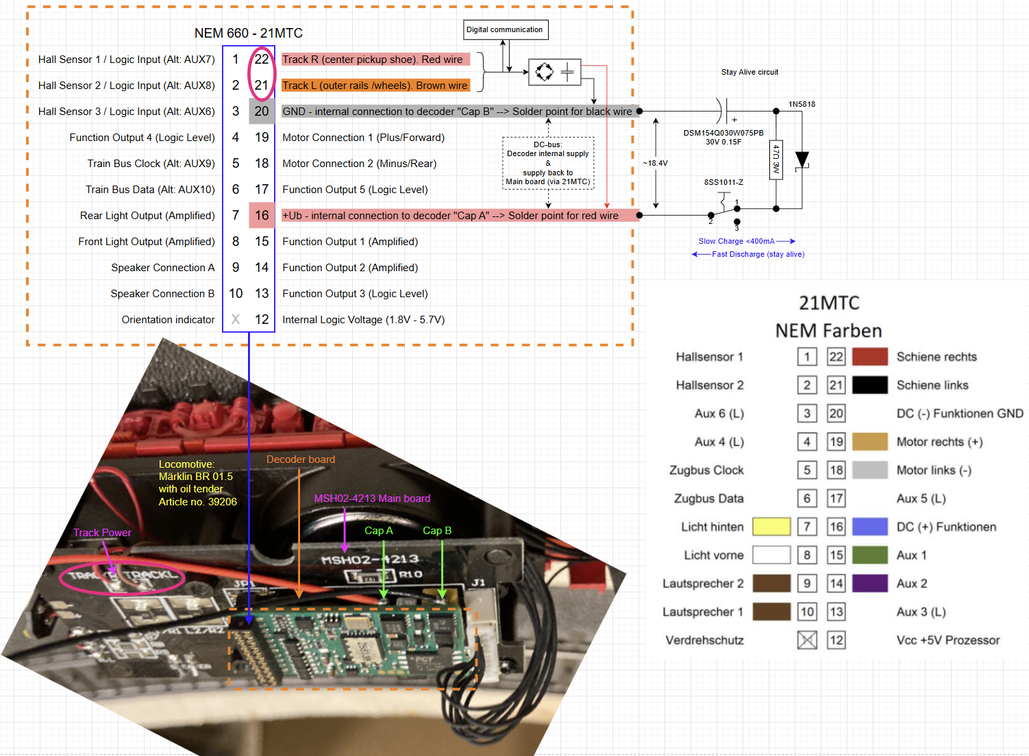 I’m considering adding a stay-alive capacitor circuit to my Märklin loco 39206, BR 01.5 - and maybe more of my locos, eventually. Got a small size C-track layout. Sometimes my locos struggle to go over turnouts without stopping, especially at low speeds. As this is a well known problem with Märklin, I hope there’s someone out there who have tried to do something similar. The factory installed decoder for this locomotive (sitting in the tender) does not come with a connector for stay alive capacitor, unlike the mSD3 /mLD3 decoders for retrofit (for example the 60975). I’m not very keen on replacing my decoder(s) just to get this connectivity. So I’ve been trying to figure out how the decoder is working and where to connect in with my add-on circuit. It seems that the decoder has its own rectifier from AC digital to DC, and a smoothing capacitor of 470µF. Not to be mixed with the rectifier on main board below (main board rectifier is not used in this loco?). This gives the +Ub, aka DC-bus, used internally on the decoder and for motor switching transistors. Also being fed back to main board via the 21pin MTC connector. I suspect +Ub is controlled by a transistor or something. The positive side of the smoothing cap is not connected directly to MTC pin 16 (+Ub), so there must be some kind of switch between. My guess; in case of “overcurrent”, measured by a small low ohmic resistor for current sense just after rectifier and capacitor, this transistor will cut power out to avoid stuff burning up (short circuit or high loads). Also off by default (normally open) when decoder is not powered. Negative side of smoothing cap is connected directly to MTC pin 20 (gnd).
