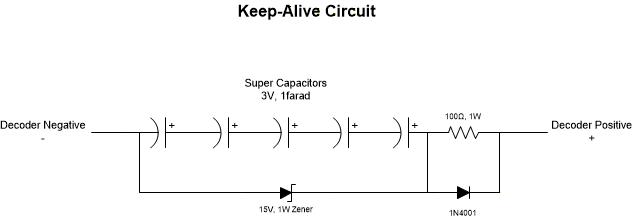 The setup in picture 1 provides plenty of stay-alive power to help a loco bridge most gaps. The capacitors that I use (Digikey #4688-CXP-3R0105R-TWX-ND) are pretty small, so I can fit 5 of them in a tender (see picture 3). 15 volts with a Zener diode for protection works well. I have not had any issues with this setup.