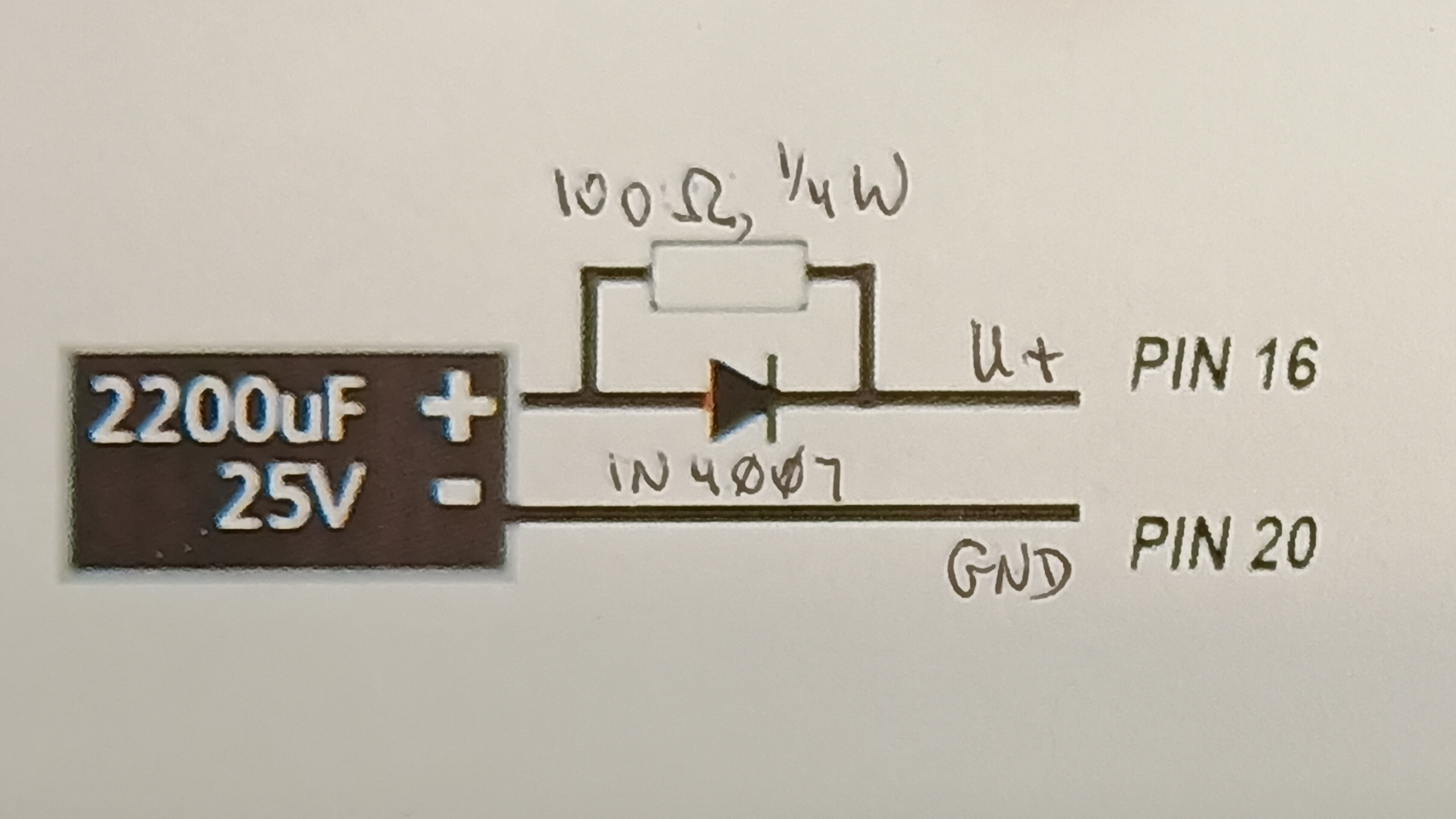 It is a pain to get my solder tip onto the positive side of the smoothing cap, really tight space. Alternatively; I’ve found a good spot to solder on another capacitor, easy access, but this one is connected to MTC pin 16, which is +Ub after the current measuring resistor and safety switch. Guess this will also work, as long as the “+Ub switch” stays on (no overcurrent or other major issue..) But feels a bit more risky to solder in here.